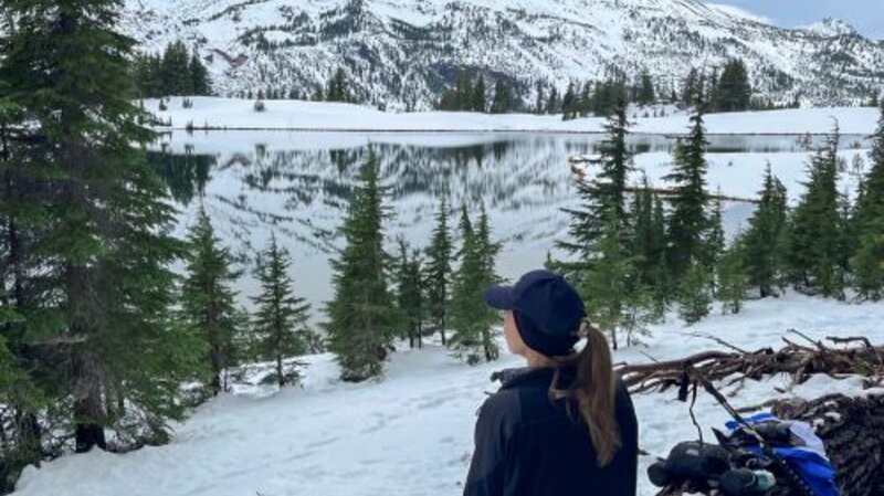 The weather was cloudy and cool, and during our hike the expected "ring of fire" eclipse occurred, resulting in a drop in temperature and a darker sky. However, after that event, the rest of our hike up to Green Lakes was uneventful, outside of hitting more and more snow the higher we climbed. At the second log bridge we put on our microspikes for safety against slippery conditions and the rest of the hike was fine. We had to do some postholing once we reached the first lake, but it was well worth the effort to travel to the far side which fewer people travel to, but is among our favorite spots due to the beautiful views of South Sister which can be mirrored in the lake. We also trekked a bit up the east side of the largest Green Lake, but decided against going further and returned back after enjoying lunch and the views.