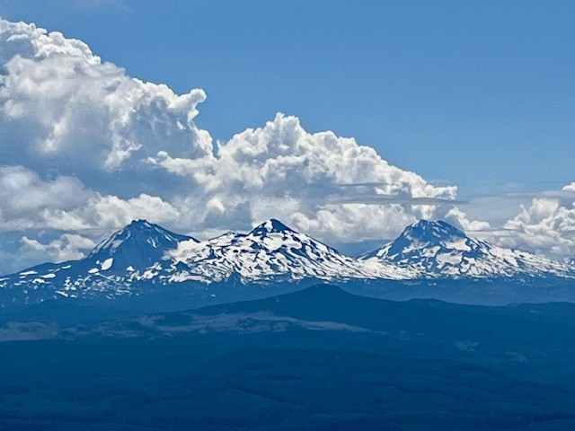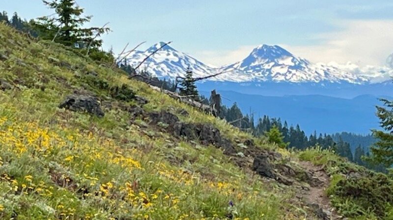 While the higher Cascade Mountain hikes were still snow covered in mid July 2025, Maxwell Butte was snow free and offered spectacular mountain views. On July 12, only one other hiker was seen the entire day and while mosquitoes were a problem in the morning, they were gone once the sun rose. The hike from the trail head to the top of Maxwell Butte is a moderate, forested trek with 2453 feet of elevation gain over 5.10 miles one way; the last steep mile up the butte can be more challenging with switchbacks on pumice on parts of the path. However, the higher hikers get, the more the views of Mt. Washington, North and Middle Sister, The Husband and the Wife become visible until near the top, the full view of Tam McArthur Rim and Broken Top can also be seen. Hoodoo Ski Bowl and Hayrick Butte really stand out as well in the topography in a way that is not visible from lower elevations. Looking east, Three Fingered Jack dominates the skyline and north, fabulous views of Mt. Jefferson, Mt. Hood and the eight lakes basin are seen.