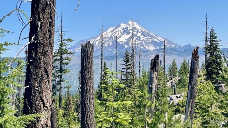 The trail splits here. Hikers wishing to take the path next to Marion Lake can do so, and others wishing to bypass the lake and travel on to either Marion Falls or Marion Mountain can do that. The path to Marion Mountain connects again with the path next to the lake, but past the lake the path steepens as hikers gain elevation hiking up Marion Mountain. There are scattered open areas (complete with the remnants of forest fires) and forested areas as the remaining miles to the top of the mountain are climbed. At the top of the mountain the views of Mt Jefferson and Three Fingered Jack are wonderful. The viewpoint is on a narrow rocky outcrop with steep drop-offs on each side. On July 13, 2024, butterflies and summer wildflowers were abundant.