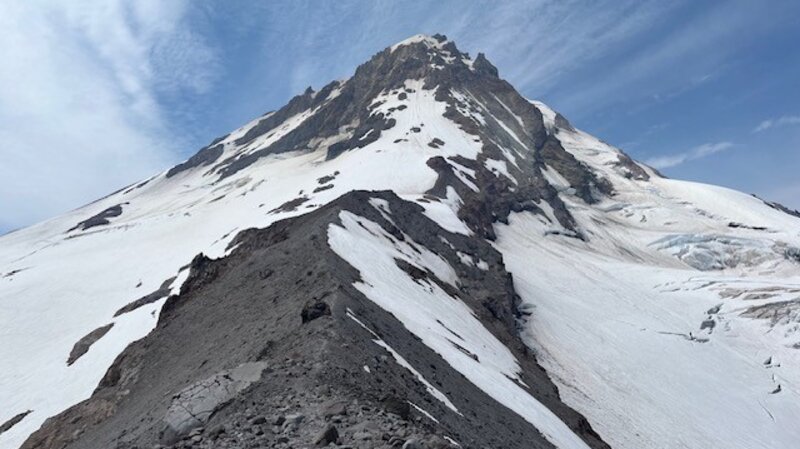 Past the stone shelter, the trail passes through rocky landscape until the actual push up the lower sections of Cooper Spur begins. Switchbacks take hikers up the spur, but near the top a snow field (this was July 27, 2024) creates a barrier that makes summiting the spur challenging. Those who wish to make it to the top need to boulder along the ridge overlooking Eliot Glacier until they reach the summit.